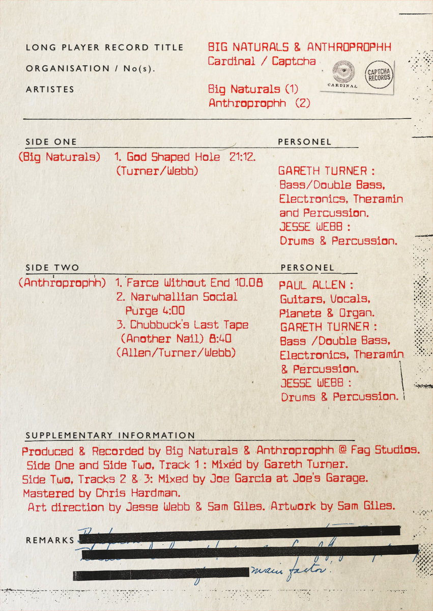 We are proud to be able to bring to you the devastating unholy union of industrial strength punk fury and psychedelic alien soundtracks that is the Big Naturals & Anthrorprophh LP.