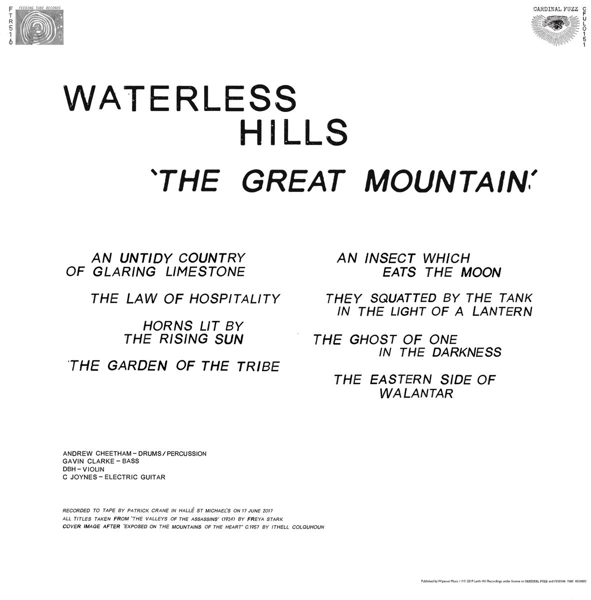 The album was recorded in one day direct to 1/4” tape at Hallé St Michaels, Manchester. All tracks were wholly improvised, and the tapes document a slowly-evolving interplay and, at times, ‘on-the-edge’ exchange between the players. The results were eventually shaped into an imaginary soundtrack to an orientalist western loosely themed around Freya Stark's 1935 travelogue 'The Valleys Of The Assassins' and the surrealist occult art of Ithel Colquohoun. The album itself is closely paired with Waterless Hills’ debut release, an 8” lathe of two pieces captured at the same session and released in an edition of 99 copies on All Saints Day 2019 by Sonido Polifonico (www.sonidopolifonico.co.uk). This debut release garnered spins on the BBC Radio 3’s Late Junction, Stuart Maconie’s BBC 6 Music show Freak Zone, and Jeff Conklin’s Avant Ghetto show on WFMU, together with favourable reviews from Byron Coley in Wire magazine.